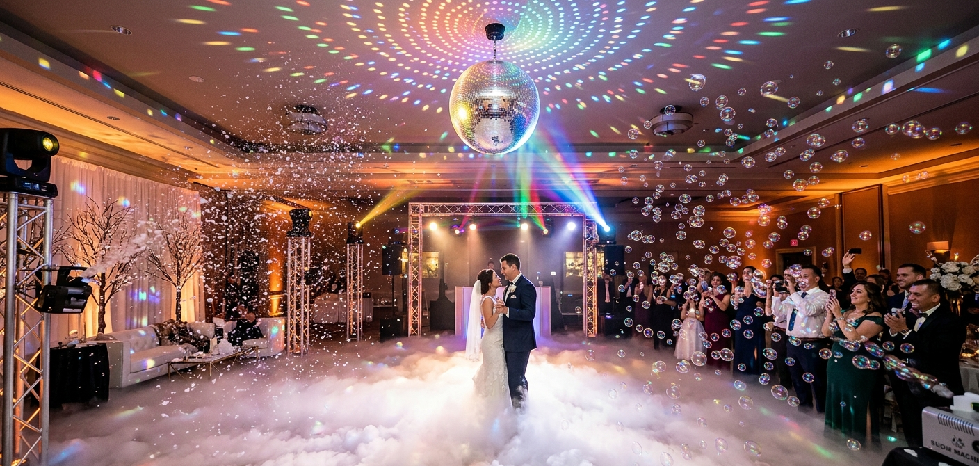 Transform your venue into an immersive environment with our professional-grade special effects. From the classic elegance of a spinning disco ball to the magical 'dancing on a cloud' effect created by our ground-hugging fog, we provide the visual depth that makes photos look incredible and moments feel legendary. Whether you want the whimsical touch of a bubble machine or a winter wonderland created with foam snow, we have the specialized equipment to bring your vision to life.